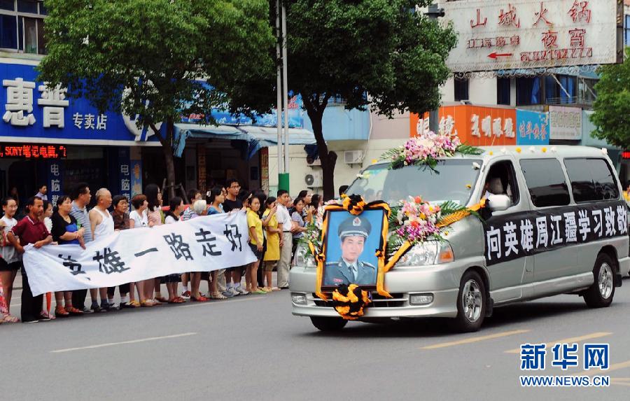 圖為7月6日,周江疆靈車出殯,人們夾道為其送別。追悼會時,數千名羣眾守候在靈堂外,為這名捨身救人的80後“最美高富帥”送行。新華社發(趙蓓莉 攝)