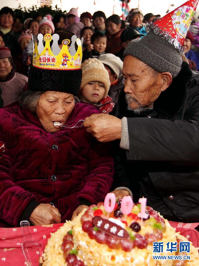 2012年12月28日,施四凡給老伴兒劉麼姑喂蛋糕。當日,是湖南常德津市市保河堤鎮澧賦村施四凡和劉麼姑夫妻共同的百歲生日,親朋好友和當地領導齊聚二老家中,為這對百歲夫妻祝壽。施四凡和劉麼姑同是1912年12月28日出生,已攜手走過78年。新華社發(潘敬林 攝)