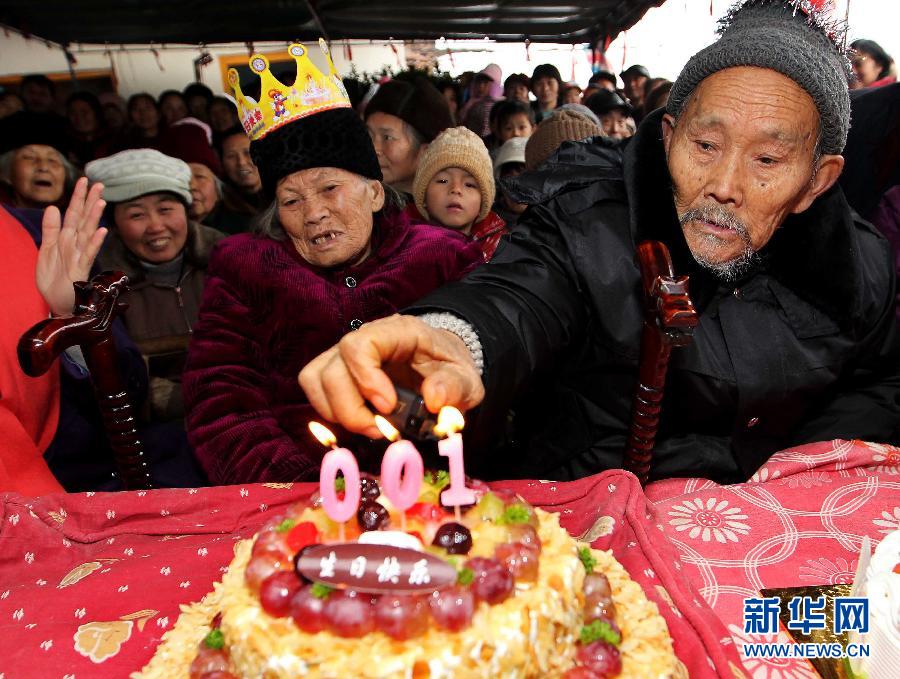 2012年12月28日,施四凡點燃生日蛋糕上的蠟燭。當日,是湖南常德津市市保河堤鎮澧賦村施四凡和劉麼姑夫妻共同的百歲生日,親朋好友和當地領導齊聚二老家中,為這對百歲夫妻祝壽。施四凡和劉麼姑同是1912年12月28日出生,已攜手走過78年。新華社發(潘敬林 攝)
