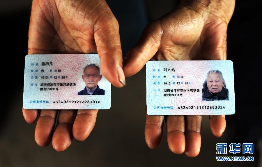 2012年8月30日,施四凡和劉麼姑夫妻一起展示兩人的身份證。當日,是湖南常德津市市保河堤鎮澧賦村施四凡和劉麼姑夫妻共同的百歲生日,親朋好友和當地領導齊聚二老家中,為這對百歲夫妻祝壽。施四凡和劉麼姑同是1912年12月28日出生,已攜手走過78年。新華社發(潘敬林 攝)