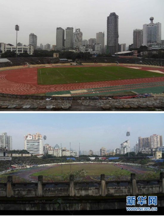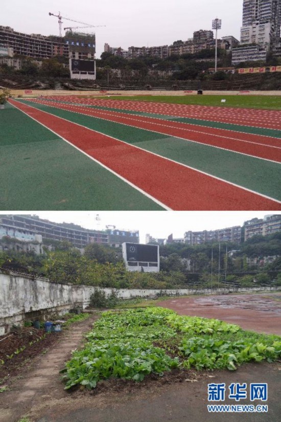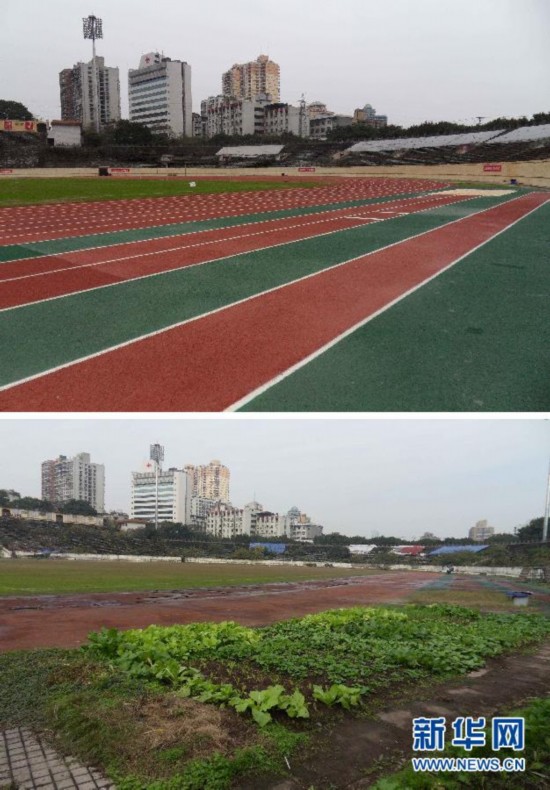 這張拼版照片顯示的是:重慶大田灣體育場煥然一新(12月29日攝,上圖);種上蔬菜的重慶大田灣體育場(11月26日攝,下圖)。 經歷“菜地”風波的重慶大田灣體育場,經一個月的整修後煥然一新。據瞭解,重慶大田灣體育場因改造修繕遲遲不動工,場地荒廢被門衞開闢種蔬菜。經輿論曝光後,當地政府投入180萬元對場地塑膠跑道及附屬設施進行了整修,並免費對市民開放晨練。重慶大田灣體育場是新中國第一個甲級體育場,1951年在賀龍的主持下修建,佔地面積12萬平方米,是新中國成立初期重慶十大建築之一。 新華社發(週會 攝)