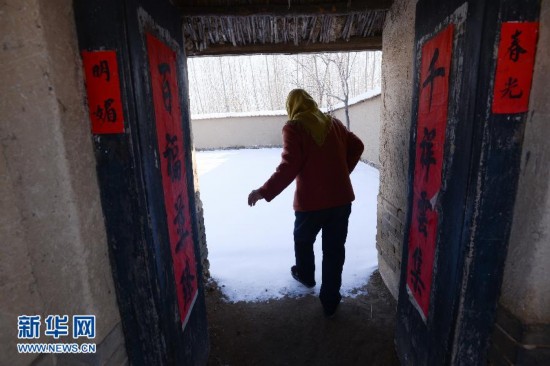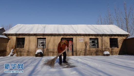 12月30日,莫言的二嫂葛金芳在莫言舊居院內清掃積雪。莫言舊居位於山東高密市大欄鄉平安莊靠近膠河的地方,據介紹,莫言1955年到1976年,在這裏度過從出生到從軍離開約22年的時間。記者12月30日抵達舊居時,見到舊居的院子被前一天的降雪蓋得嚴嚴實實,5間老屋裏擺放着一些過去的用品,泥牆上則新嵌了一塊刻有“莫言舊居”的大理石。新華社記者王建華攝