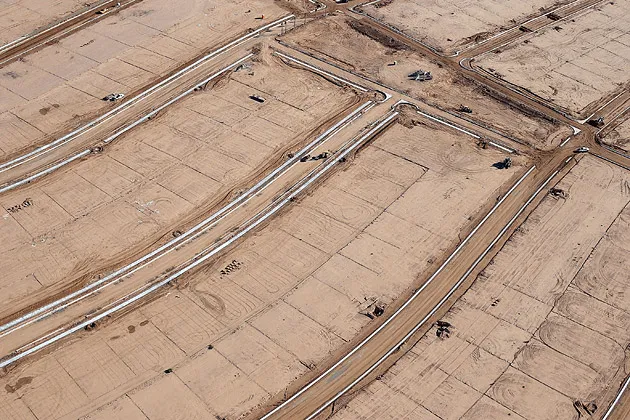 空置的土地和未完成的道路在亞利桑那州梅薩的新住宅開發項目中可見,時間是3月6日攝影:賈斯廷·沙利文/蓋蒂圖片社 (下午5:15,10月28日:增加了來自約翰·伯恩斯房地產諮詢公司的地價上漲數據。)