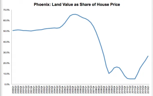 根據戴維斯的指標,鳳凰城看起來並沒有那麼可怕。土地在房屋價值中的份額在2006年為65%,然後在2011年驟降至5%。自那時以來,它急劇上升,但根據戴維斯的計算,在2013年第一季度仍僅為26%。他要到明年二月左右才能得到2013年第三季度的數據。
