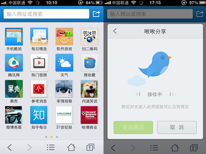 搜狗瀏覽器是去年剛剛推出的手機版瀏覽器。在學習、借鑑同類產品經驗的基礎上,做出了自己的特色。今年6月,搜狗緊隨QQ瀏覽器的腳步,推出了基於手機推送功能的“搜狗飛傳”,將PC端的網址、圖片、文件一鍵推送到手機,實現“跨屏”。但這種推送是電腦到手機的單項傳輸,讓電腦、手機、PAD完全無障礙鏈接,才是用户關注的重點。