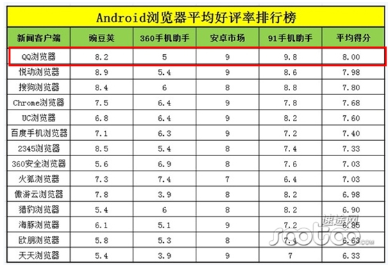 從速途提供的統計數據顯示,Android手機瀏覽器中QQ瀏覽器的好評率最高,平均得分為8分;搜狗、Chrome等瀏覽器的好評率緊隨其後;UC瀏覽器僅排名第五,用户好評率為7.6分。