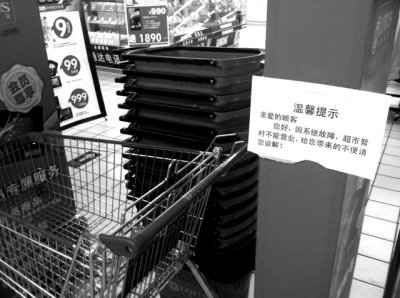 在五道口店,記者發現超市大門上張貼的通知顯示:“因系統故障超市暫時不能營業”。