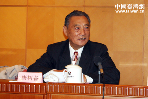 北京聯合大學台灣研究院名譽院長、前海協會常務副會長唐樹備在研討會上講話。(中國台灣網 張潔 攝)