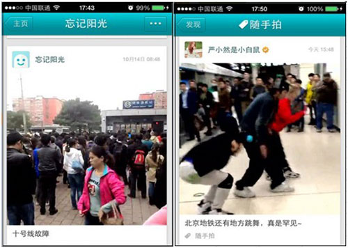 相對於文字輸入的耗時耗力,以及圖片上傳過程中的不斷轉換。作為一個獨立的App,微視集視頻拍攝與分享於一體,這意味着你能夠快速實現分享。比如你看到生日會上的囧態、以及街上的新鮮事,可以隨時打開微視拍攝、上傳分享,一氣呵成,不會讓你錯過很多精彩的畫面。像下方的視頻中,網友在乘坐地鐵上時,遇到地鐵故障,或者看到有意思的事情,馬上用微視進行播報,這肯定要比圖片、文字帶感多了吧。