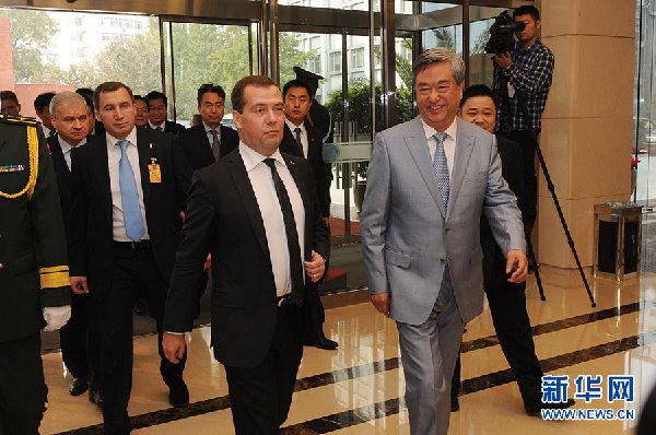 10月22日,俄羅斯總理梅德韋傑夫在新華網與中國網民在線交流。圖為新華社社長李從軍和梅德韋傑夫總理在一起。(新華網 陳競超 攝)