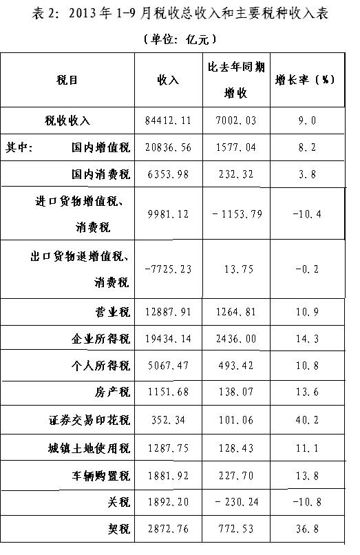 2013年1-9月,全國實現税收收入84412.11億元,同比增長9%,完成年度預算的77.3%。
