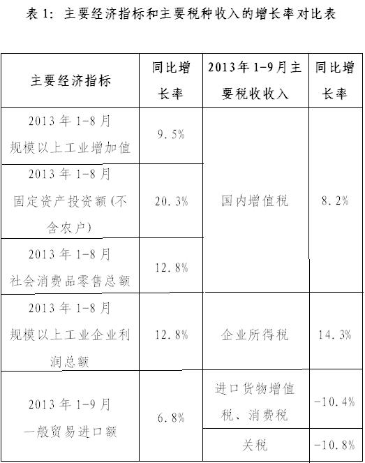 前三季度税收收入平穩增長的主要原因:一是去年同期基數較低。2012年前三季度,國內經濟增長緩慢,增值税、企業所得税同比分別增長5.8%和14.7%,遠低於往年增長速度;受政策調整影響,去年同期個人所得税同比下降8.4%。二是前三季度經濟形勢有所好轉。1-8月,規模以上工業增加值、固定資產投資額(不含農户)、社會消費品零售總額、規模以上工業企業利潤總額同比分別增長9.5%、20.3%、12.8%和12.8%。三是房地產交易活躍、價格上漲等因素使得相關税種收入高速增長。1-8月,商品房銷售額同比增長34.4%,契税、房地產營業税同比分別增長36.8%和37.4%。