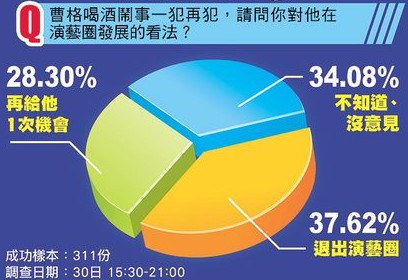 台媒昨針對“曹格喝酒鬧事一犯再犯,請問你對他在演藝圈發展的看法?”進行民調,311份樣本中,37.62%民眾認為他應退出演藝圈,28.3%民眾認為應再給他1次機會,34.08%民眾則表示不知道、沒意見。(中國台灣網 高旭)