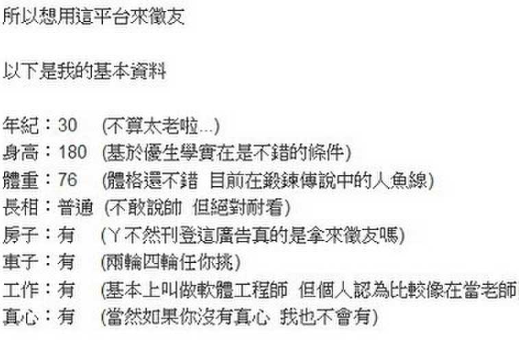 看到這邊還沒有完,緊接着房東附上自己的基本資料,身高180公分、體重76公斤,目前正在鍛鍊傳説中的“人魚線”,至於長相雖然不敢説帥,但絕對耐看,外加房子、車子通通有,再附上一顆“真心”。