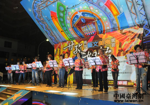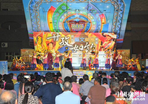 中國台灣網11月13日高雄消息 日前,四川省民族歌舞赴台交流團第二場演出在台灣高雄市三民區義民廟前的空地如約舉行。本場演出除了四川民族歌舞團帶去的節目之外,台灣同胞也上台進行了聲樂演奏、舞蹈等表演,兩岸同胞同樂。而演出場地一圈,還有數十個台灣美食大排檔,當地市民除了可以欣賞文藝表演,也還可以品嚐到當地美食。