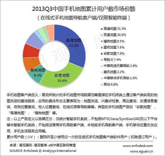 近日,互聯網數據分析機構易觀發佈了《2013年Q3手機地圖市場份額數據報告》。據報告顯示,目前我國在線式手機地圖導航客户端(限智能終端)市場中,專業手機地圖高德地圖以31.3%的市場佔比連續第八個季度同比居首,競爭優勢明顯、行業地位穩定。