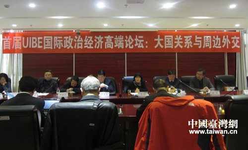 中國台灣網12月21日北京消息 12月21日,首屆UIBE高端政治經濟論壇在對外經濟貿易大學召開。來自北京大學、清華大學、外交部等國內著名高校、科研院所和政府部門的50餘位專家學者,圍繞“大國關係和周邊外交”的主題進行了深入探討與交流。