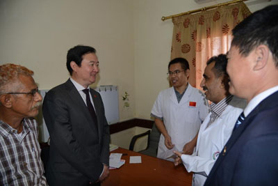 當晚,常大使抵達荷台達市。他顧不上先安頓休息,直奔我援也醫療隊荷台達分隊看望慰問醫療隊員。常大使與隊員們談心聊天,瞭解他們的工作和生活情況。常大使表示,長期以來,我援也醫療隊遠離祖國和親人,克服了種種困難,以精湛的醫術和高尚的醫德,全心全意為也門人民服務,促進了也門醫療衞生事業發展和人民健康水平提高。希望大家繼續發揚“不畏艱苦,甘於奉獻,救死扶傷,大愛無疆”的精神,為深化中也友誼作出更大貢獻。隊員們紛紛表示將繼續弘揚中國醫療隊精神,辛勤工作,無私奉獻,完成好黨和國家賦予的光榮使命。