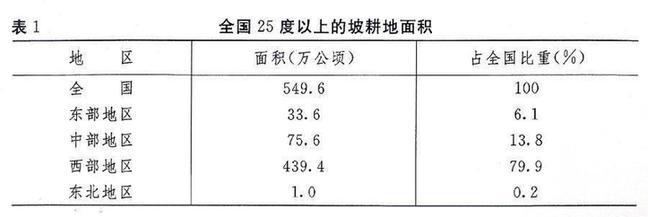 全國耕地按坡度劃分,2度以下耕地7735.6萬公頃(116034萬畝),佔57.1%;2~6度耕地2161.2萬公頃(32418萬畝),佔15.9%;6~15度耕地2026.5萬公頃(30397萬畝),佔15.0%;15~25度耕地1065.6萬公頃(15984萬畝),佔7.9%;25度以上的耕地(含陡坡耕地和梯田)549.6萬公頃(8244萬畝),佔4.1%,主要分佈在西部地區(見表1)。