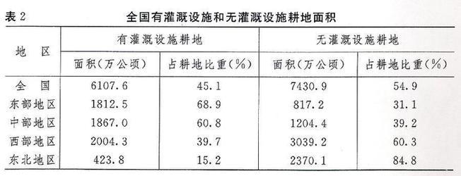 全國耕地中,有灌溉設施的耕地6107.6萬公頃(91614萬畝),比重為45.1%,無灌溉設施的耕地7430.9萬公頃(111463萬畝),比重為54.9%。分地區看,東部和中部地區有灌溉設施耕地比重大,西部和東北地區的無灌溉設施耕地比重大(見表2)。