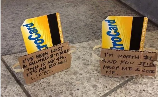 看看這對在聯合廣場地鐵站地板上的MTA卡:右邊的標籤特別尖鋭地指出了主人的浪費: