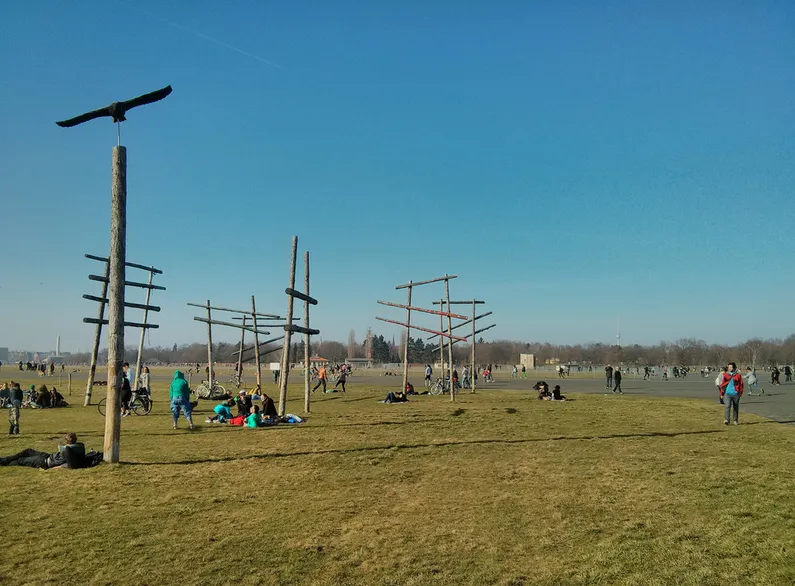 Tempelhof公園的圖片。照片由Flickr用户Chris(上)和Patrick Tschudin提供底部很容易看出為什麼許多人喜歡現在的Tempelhofer Feld。它佔地878英畝,比紐約的中央公園還大,是一片寬廣的草原,其大部分無樹的開闊地帶在大城市中心極為罕見。這裏有一種非正式、即興的感覺。現在,風箏衝浪者在舊跑道上飛馳,而當地人種植的無圍欄蔬菜地在草坪上形成了棋盤格。公園全年都很繁忙,部分原因是它的開放性使其成為享受柏林有限冬日陽光的好地方。