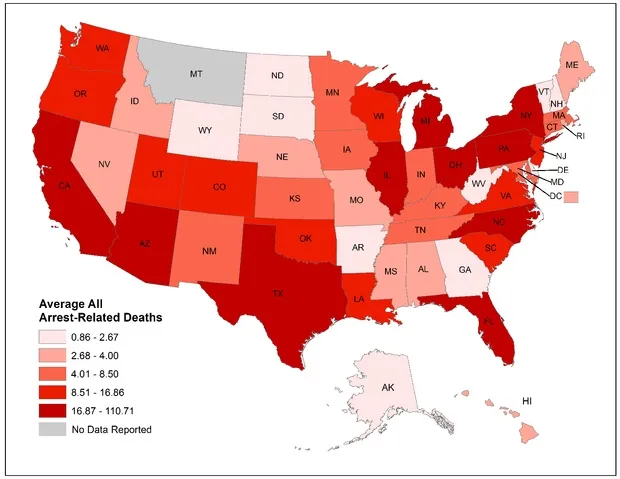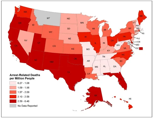東北部州的逮捕相關死亡人數相對較低。紐約每百萬居民僅有1.9例死亡,而新澤西州更低,只有1.3例。馬薩諸塞州是逮捕相關死亡人數最低的州之一,只有0.9。