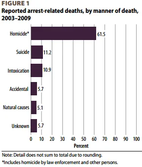 我們從BJS關於與逮捕相關的死亡的數據開始。2003年至2009年間報告了近5000例(4813例)與逮捕相關的死亡。這些包括所有在執法官員拘留期間死亡的人,包括自殺、因中毒和事故導致的死亡。警察的殺人事件在2003年至2009年間大約佔所有與逮捕相關死亡的六成,如左側圖表所示,比例從2005年的約55%低點到2009年的68%高點。BJS還警告“數據更能代表與逮捕相關死亡的性質,而不是發生的數量。”
