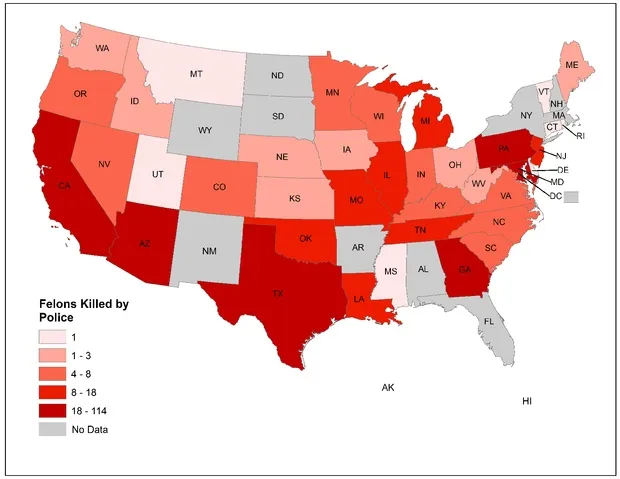 第二組地圖涵蓋了被警察殺害的罪犯。這些數據來自FBI的統一犯罪報告,數據為2012年,最新的可用年份。這些數字同樣存在問題。FBI的數據是自我報告的,並不是所有警察部門都參與報告過程。數據僅捕捉那些被定罪或正在實施重罪的人所導致的死亡。此外,正如Fischer-Baum指出的,“警察的不當殺人”並不是一個分類,因此像邁克爾·布朗這樣的死亡可能不會被計算在內。此外,一些州——例如紐約——的記錄為零,這表明存在缺失值和嚴重的漏報。
