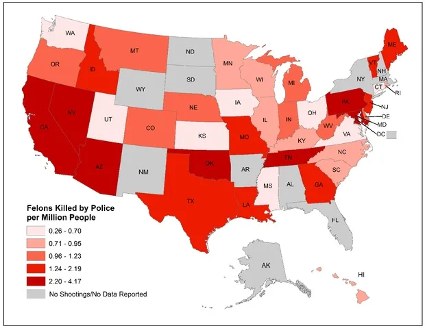 下面的第四張地圖顯示了每百萬居民中被警方殺害的罪犯數量,再次控制人口因素。西南部州的集中度再次最高。亞利桑那州以每百萬4.2人的死亡率領先,其次是馬里蘭州(3.3)、加利福尼亞州(3.0)和內華達州(2.9)。