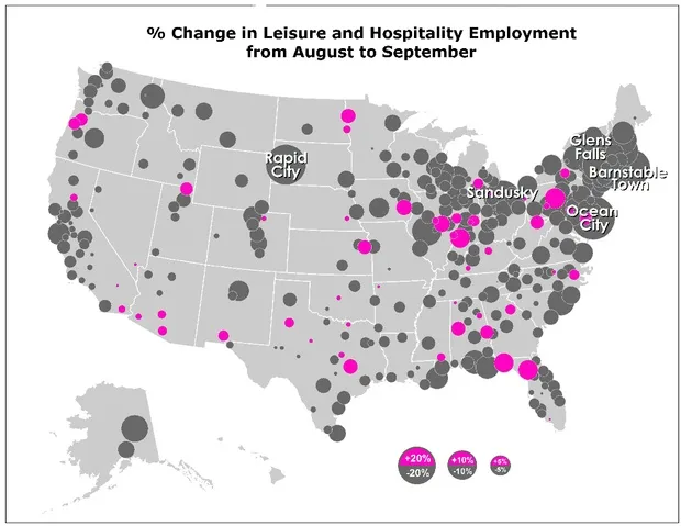 上面的地圖顯示了從八月到九月休閒和酒店業就業的變化。全國範圍內,休閒和酒店業就業在這幾個月之間下降了大約3%。但對於一些大都市來説,情況要糟糕得多。受影響最嚴重的地方,毫不奇怪,是東北部的夏季度假勝地。兩個地方——新澤西海岸的海洋城(-24.8%)和紐約的格倫斯福爾斯(-24.5%)——在淡季期間大約失去四分之一的工作崗位。而另外兩個地方——馬薩諸塞州的巴恩斯特布爾鎮,在科德角(-19.5%);和南達科他州的拉皮德城(-20.9%),距離拉什莫爾山和每年的 斯圖吉斯摩托車集會 僅半小時車程——失去五分之一的工作崗位。