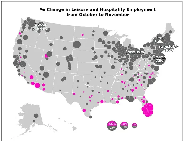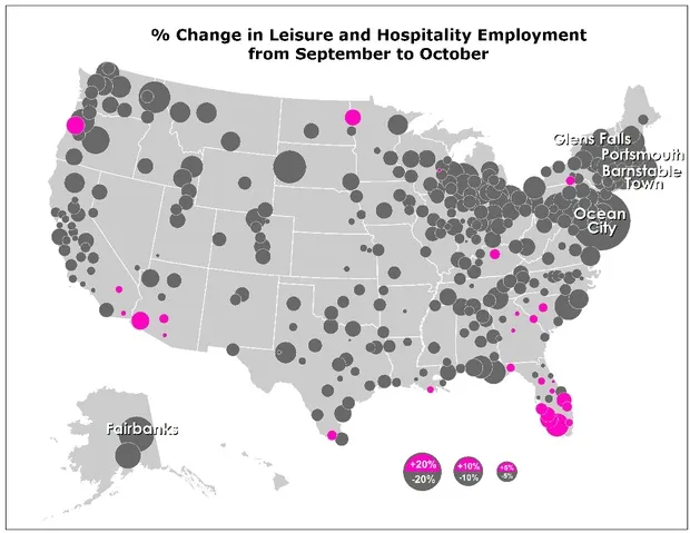第二張地圖顯示了九月到十月的休閒和酒店就業變化。全國範圍內,休閒和酒店就業在這幾個月之間下降了1.7%,在八月和九月之間下降了3%的基礎上。但一些度假小鎮在這些早秋月份受到的打擊更大。新澤西州的海洋城在九月到十月之間的休閒和酒店就業下降了驚人的-37.6%。紐約州的格倫斯福爾斯(-15.6%)和科德角的巴恩斯特布爾(15.3%)在此期間也出現了類似的下降。