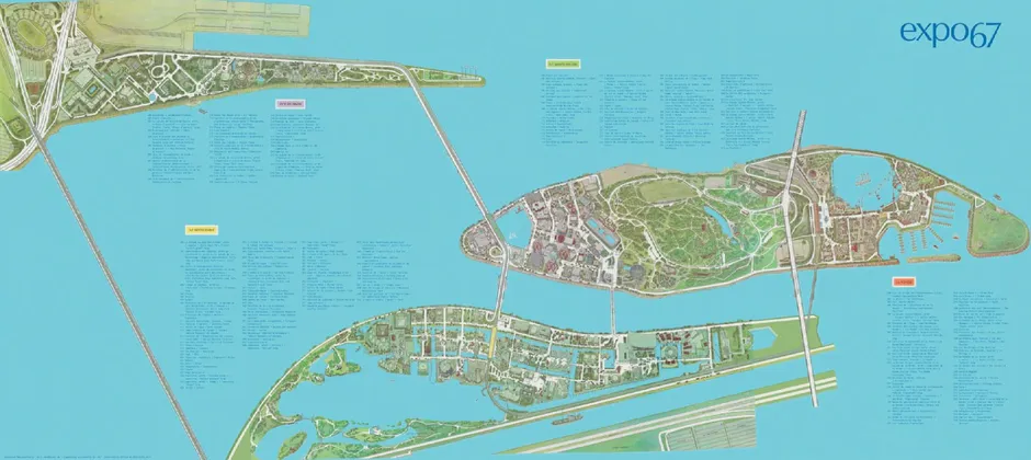 世博會67的地圖。維基媒體公用資源利用來自城市新地鐵系統的2500萬噸建築廢料,博覽會創造了一個新島(諾特丹島),擴大了一個已經存在的島(聖海倫島),並將一個碼頭改造成一個社區(哈夫城)。它還創造了北美第一個完全自動化的快速交通系統,世博快線,服務於三個世博會區域,並最終於1972年停用。博覽會的最終建設成本為4.32億加元(約29億加元在2014年)。