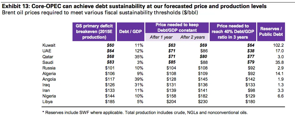 在海外,較低的油價最終將開始影響一些國家的經濟以及它們管理債務的能力。高盛計算了一些數字,並得出了它認為一些主要石油生產國需要的油價,以保持其赤字在可控範圍內。核心的OPEC生產國——科威特、阿聯酋、卡塔爾和沙特阿拉伯——都可以在當前油價以下運作。然而,往下看,情況就變得棘手:高盛表示,俄羅斯需要每桶101美元,伊拉克需要126美元,而伊朗需要133美元。