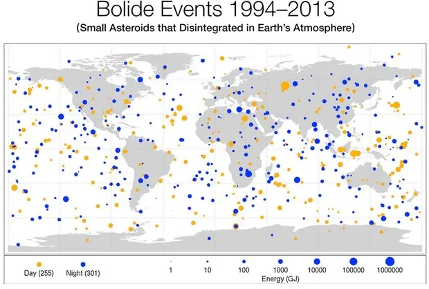 美國宇航局近地天體計劃的工作人員表示,在此期間最強大的火球確實是切爾亞賓斯克的,攜帶的能量相當於50萬噸TNT。他們希望支撐這張地圖的數據能夠揭示下一個巨大流星何時可能墜落,因為這樣的震撼事件即將發生……某個時候。太空機構寫道: