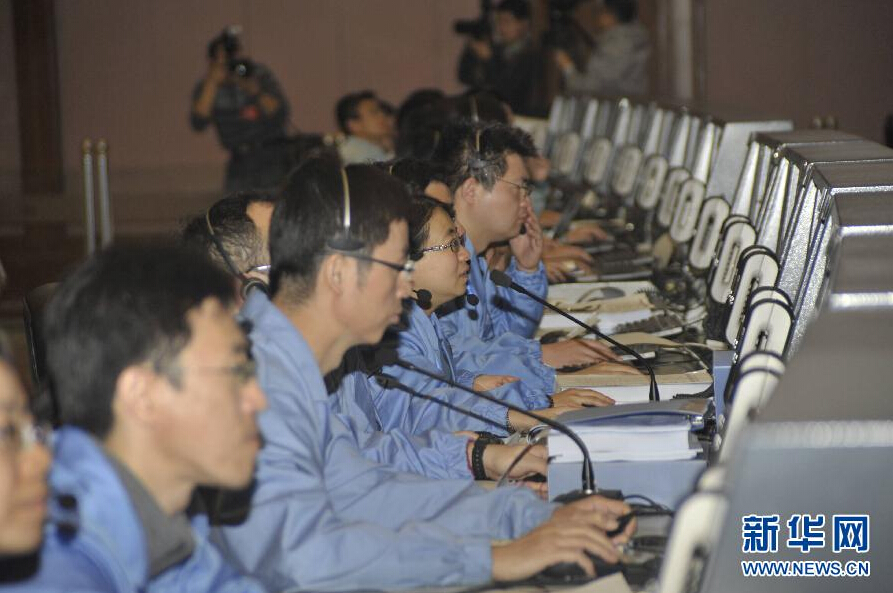 在北京航天飛行控制中心,調度指揮人員在執行探月工程三期再入返回飛行試驗器測控任務