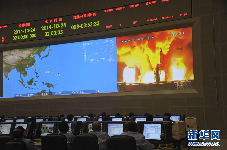 北京航天飛行控制中心飛控大廳內拍攝的長征三號丙運載火箭點火發射的場景