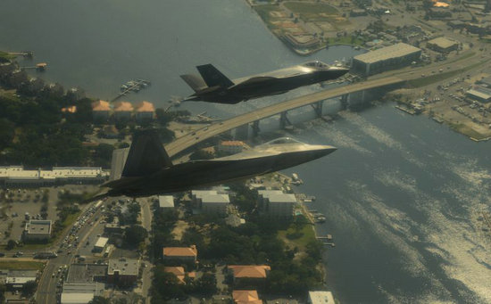 美國空軍第33戰鬥機聯隊一架F-35A戰機與第325聯隊的一架F-22A戰機共同組成編隊飛行。