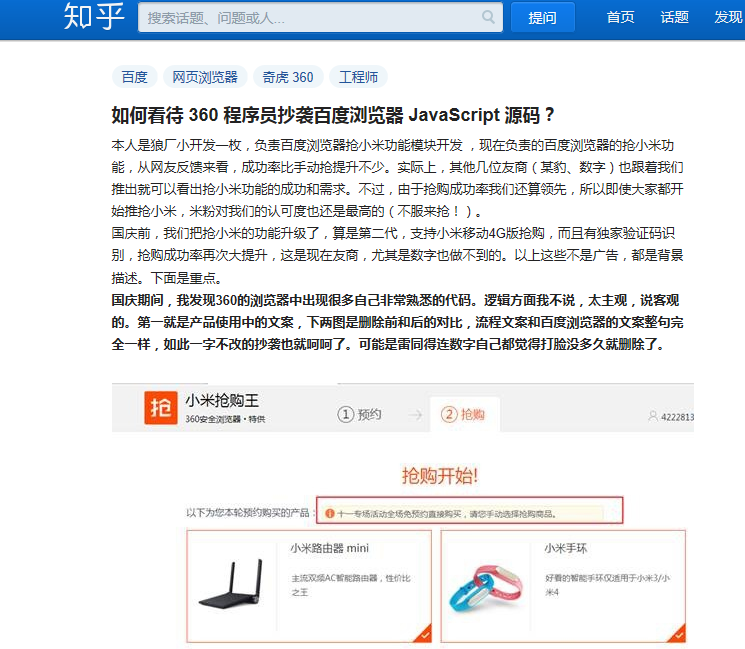 據悉,由於百度瀏覽器搶米神器的技術先進,用户滿意,近期更是曝出360瀏覽器“代碼抄襲門”事件,360瀏覽器推出的搶小米插件不僅外觀與百度瀏覽器搶米神器毫無差異,甚至連代碼以及素材所鏈接的服務器域名也都原封不動指向百度服務器。由於曝光內容詳實,在知乎和卡飯等知名論壇引發網友熱議,而這也正好顯示出百度瀏覽器搶米神器技術創新優勢。不過,據百度瀏覽器工程師透露,由於360瀏覽器涉嫌抄襲的代碼屬於第一代的搶米技術,在國慶期間使用360瀏覽器搶購小米鮮見成功。
