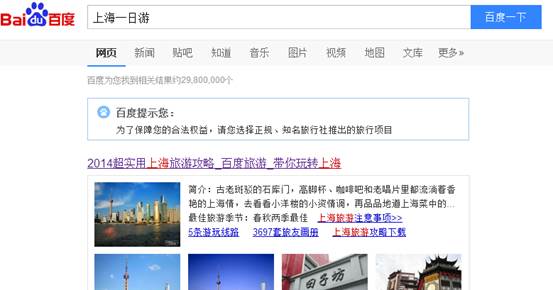 十一黃金週掀起的旅遊熱還未降温,APEC期間北京放假的消息又引發新一輪的旅遊信息搜索熱潮。近日,有不少網友爆料稱,在搜索“上海一日遊”等旅遊信息的時候,發現搜索結果頁面出現了“新變化”。筆者通過在百度搜索“上海一日遊”後發現,搜索結果頁左側上方出現了一個醒目的“百度安全提示”框,提醒網民:“為了保障您的合法權益,請您選擇正規、知名旅行社網站推出的旅行項目。”