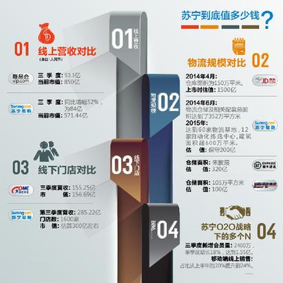 按照上面算的賬,蘇寧雲商僅在蘇寧易購、蘇寧物流和線下渠道上的合理估值,就應該達到“1.5唯品會+順豐+2個國美”的估值,高達1900億元。可是蘇寧還有和中信銀行的REITs合作有望盤活大量物業類資產;依託於全國第二的B2C平台,蘇寧金融已經成為互聯網電商企業金融服務的前三名……國內獨有的O2O模式,使蘇寧擁有無數個N,足夠將估值算出一個天文數字。