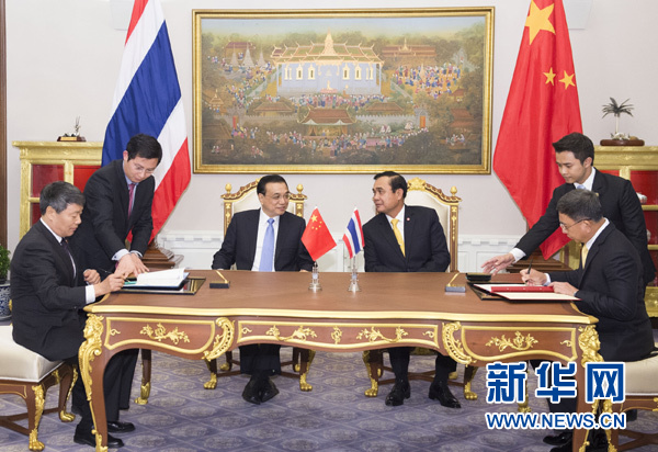 12月19日,國務院總理李克強在曼谷會見泰國總理巴育。這是會見後,兩國總理共同見證《中泰鐵路合作諒解備忘錄》和《中泰農產品貿易合作諒解備忘錄》的簽署。新華社記者黃敬文攝