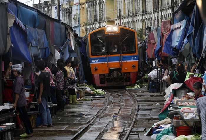 根據視點君掌握的資料,目前泰國國內鐵路基本建於本世紀初至二戰結束前,部分曾使用1435毫米的標準規,1919年時統一使用1000毫米的米軌,沿襲至今。由於基礎設施陳舊不堪、鐵軌塌陷嚴重,泰國鐵路事故頻發,但因列車時速通常低於50公里,有些路段甚至不足15公里,所以儘管出軌頻繁,幾乎沒有導致重大傷亡。更奇葩的是,曼谷以西有處鐵路市場,攤販們直接在鐵路上設點,火車來了再不緊不慢地挪開,車內乘客甚至可以隔着車窗與攤販交易,額,想象一下這幅畫面,視點君也是醉了。