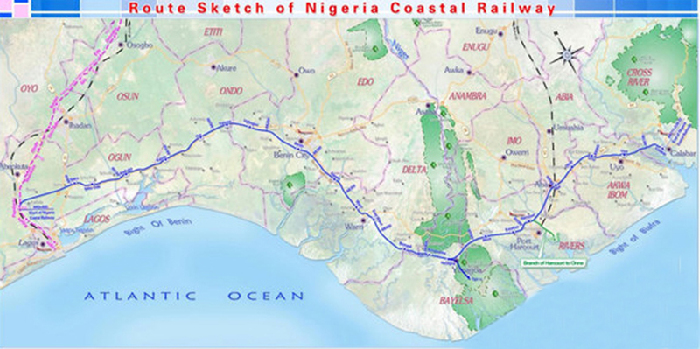尼日利亞沿海鐵路西起尼“經濟首都”拉各斯,東至卡拉巴,橫跨拉各斯州、三角州、巴耶薩州、阿誇伊博州、十字河州等沿海地區的10個州,貫穿整個尼日爾三角洲產油區,全長折算單線里程達1402公里,設計時速120公里。