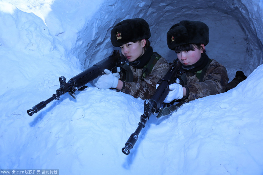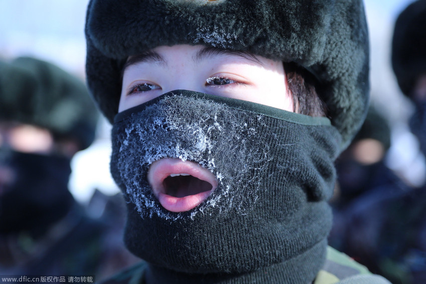 2014年12月23日,駐黑河某邊防巡邏艇大隊女兵排進行野外戰術演練。由於天氣寒冷,一名女兵臉上和眼睫毛上掛麪霜雪。