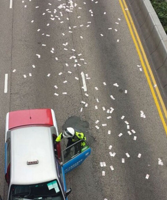據香港電台報道,香港告士打道往中環方向近舊灣仔警署對開的馬路,12月24日下午接近2時,懷疑有解款車(運鈔車)的錢箱跌出車外,大量500元及1000元紙幣,散落馬路。不少路人上前執拾,其後迅速離開。"