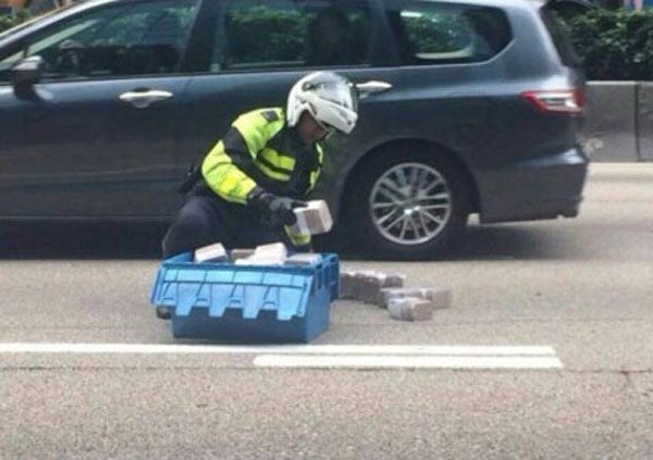 香港一運鈔車錢箱跌出車外 路人上前執拾(組圖)