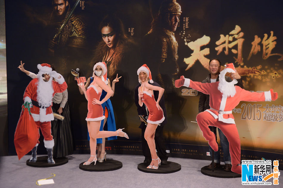當天,電影《天將雄師》首款劇情版預告片曝光,超大的戰陣場面和精彩的打鬥讓現場主創直呼過癮。談及此次和導演李仁港的合作,成龍開玩笑説:“他是沒人性的導演。”因為拍攝環境格外艱辛。此外,配合過節氣氛,主辦方提供了聖誕老人和聖誕美女的人形立牌,成龍“不幸”選中了聖誕美女,成龍微笑的臉配上女郎曼妙的身材,笑翻全場。