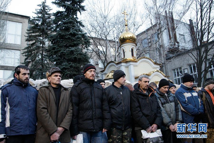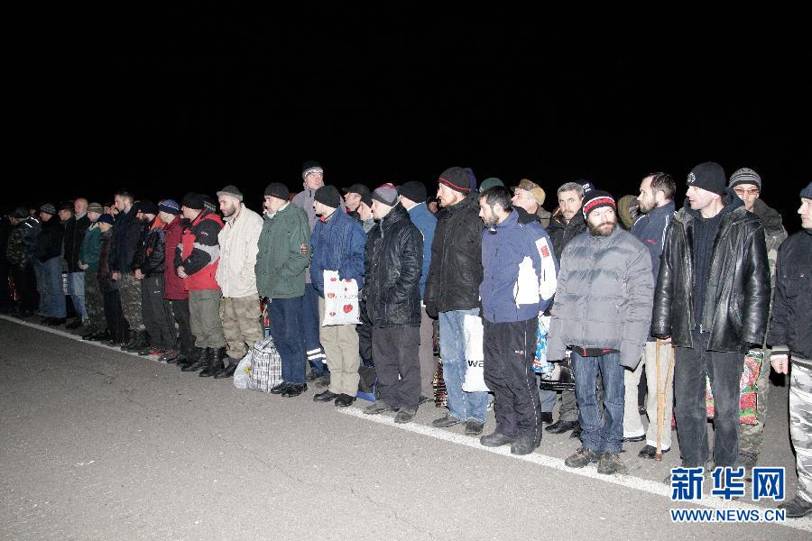 12月26日,在烏克蘭頓涅茨克,被東部民間武裝抓獲的俘虜準備被送往俘虜交換地。烏克蘭總統新聞秘書採戈爾科26日晚宣佈,被東部民間武裝抓獲的146名俘虜當天獲釋。採戈爾科對獲釋者未使用“烏克蘭軍人”的説法,也未透露作為交換條件釋放了多少名東部地區民間武裝人員。 據烏克蘭國際文傳電訊社報道,烏克蘭當局當天早些時候在東部中立地區用222名民間武裝人員交換了150名被俘軍人。新華社發(葉爾莫琴科攝)