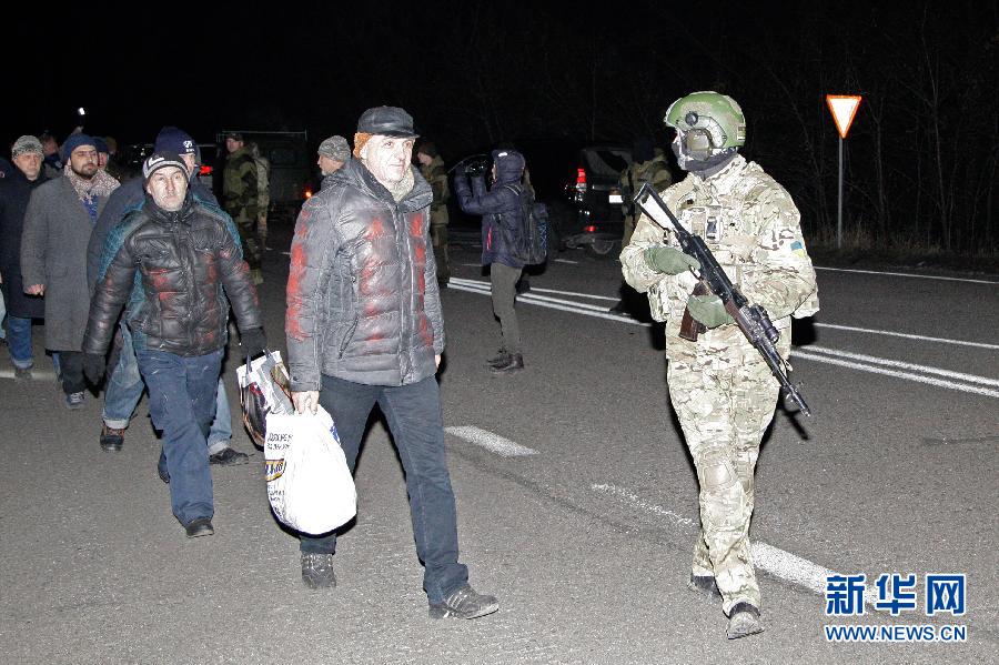 12月26日,在烏克蘭頓涅茨克附近地區,一名烏克蘭士兵(右一)在俘虜交換過程中執勤。烏克蘭總統新聞秘書採戈爾科26日晚宣佈,被東部民間武裝抓獲的146名俘虜當天獲釋。採戈爾科對獲釋者未使用“烏克蘭軍人”的説法,也未透露作為交換條件釋放了多少名東部地區民間武裝人員。 據烏克蘭國際文傳電訊社報道,烏克蘭當局當天早些時候在東部中立地區用222名民間武裝人員交換了150名被俘軍人。新華社發(葉爾莫琴科攝)